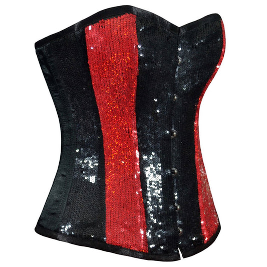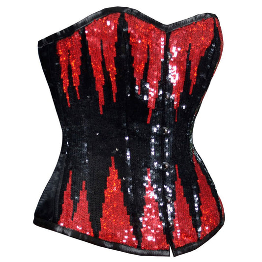 Rubinfarbenes Vollbrustkorsett mit Pailletten vorne