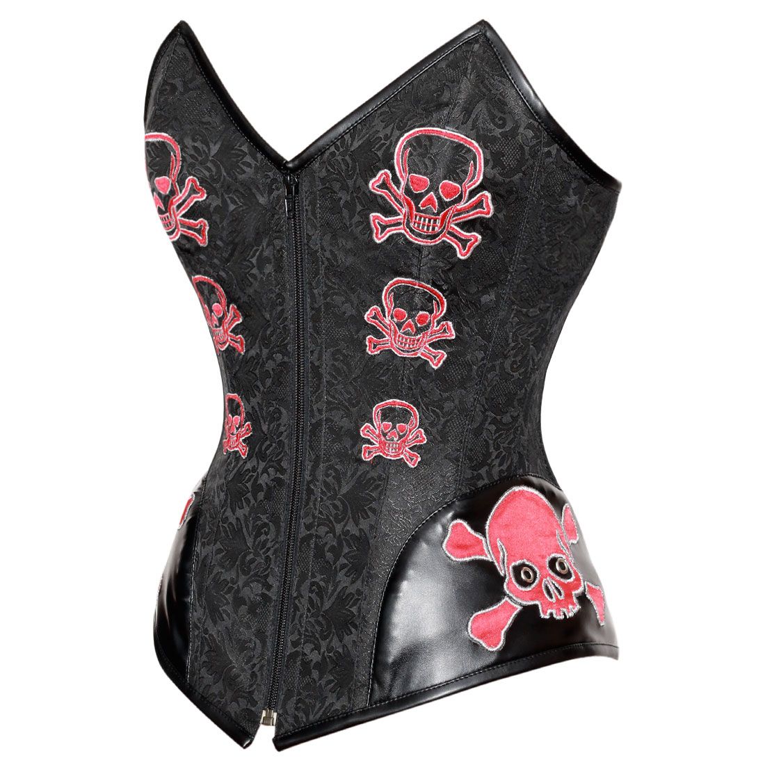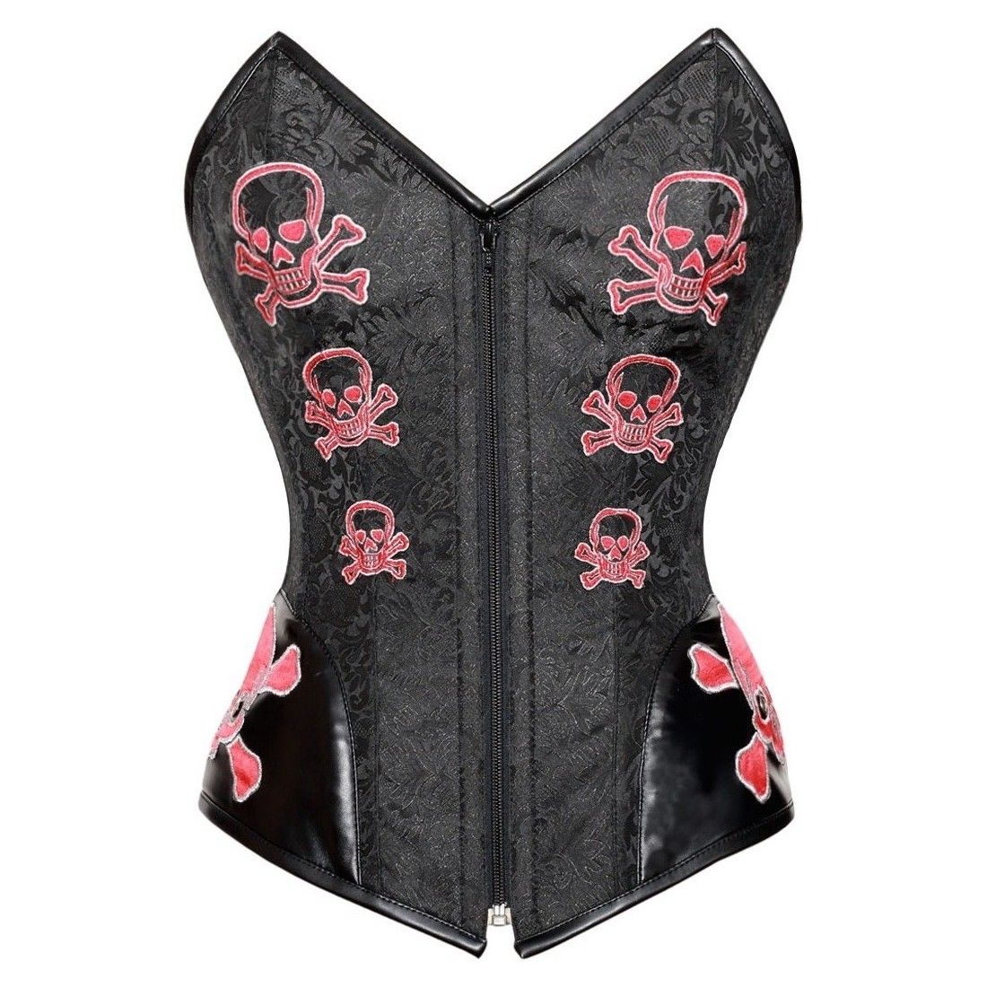 This skull corset in sweetheart over bust corset pattern is looking really attractive. Beautifully machine embroidered skull patched in red and silver color looks really haunted. Can be wearable with some long or short volume skirts or may be with stretch PU trouser.